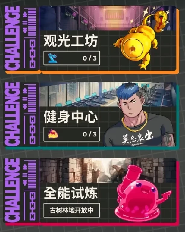 挑战关卡中,观光工坊、健身中心也是每日限定次数的,务必刷完,能打哪关打哪关。