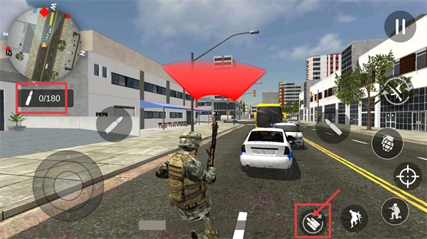 3、弹药耗尽(显示【0/180】)时,点击【换弹按钮】补充弹药,避免陷入无攻击能力的困境。