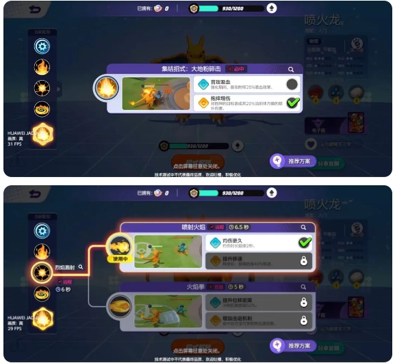 喷火龙1技能是喷火或者近身位移。输出型我们就选择喷射火焰,选择灼伤更久,增加输出。2技能建议选择火阵的减速效果,在逃生或者追杀时使用此技能能更好的黏住对手,让他们无法走动。大招是自身无敌并且从天而降的单体伤害,大招过程中对手固定原地无法进行其他操作,可以选择普攻吸血增加持久战斗力,或者选择抱摔增伤,增加百分比伤害,对于防御型宝可梦效果更佳。