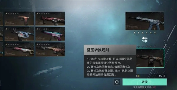 3、利用蓝图转化功能,将装备蓝图星级进行交换。不过这个蓝图转换只能同品质进行转换,如金色武器和金色武器,金色防具和金色防具(无需同部位),紫色和紫色武器。