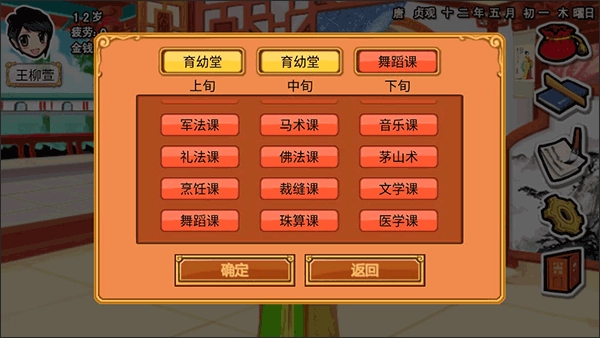 Ⅱ:十三岁一月:(去大明宫找侍女) 育幼堂,育幼堂,舞蹈课Ⅱ:十三岁二月:(去大明宫找侍女) 育幼堂,育幼堂,舞蹈课(去鸿宾楼吃酸汤小煲) (要出去玩选回屋看书)Ⅱ:十三岁三月:(去大明宫找侍女) 育幼堂,育幼堂,舞蹈课Ⅱ:十三岁四月:(去大明宫找侍女) 育幼堂,育幼堂,舞蹈课(先去鸿宾楼吃酸菜鱼)Ⅱ:十三岁五月:(去大明宫找厨子) 育幼堂,育幼堂,舞蹈课Ⅱ:十三岁六月:(去大明宫找厨子) 育幼堂,舞蹈课,舞蹈课(先去鸿宾楼吃酸菜鱼) Ⅱ:十三岁七月:(去大明宫找厨子) 礼法课,礼法课,舞蹈课(魅力已达800,亲和已达800) Ⅱ:十三岁八月:(去大明宫找太监) 礼法课,礼法课,舞蹈课(先去鸿宾楼吃酸菜鱼) (中秋猜谜就看你咯!)Ⅱ:十三岁九月:(去大明宫找御史大夫) 礼法课,礼法课,舞蹈课(比赛选舞林争霸) Ⅱ:十三岁十月:(去大明宫找羽林卫) 礼法课,礼法课,舞蹈课Ⅱ:十三岁十一月:(去大明宫找中书侍郎) 礼法课,礼法课,舞蹈课(先去鸿宾楼吃酸菜鱼)Ⅱ:十三岁十二月:(去大明宫找史部尚书) 礼法课,礼法课,舞蹈课Ⅲ:十四岁一月:(去大明宫找史部尚书) 礼法课,礼法课,舞蹈课Ⅲ:十四岁二月:(去大明宫找程咬金) 礼法课,礼法课,舞蹈课(先去鸿宾楼吃糖醋三道) (得舞服)Ⅲ:十四岁三月:(去大明宫找程咬金) 礼法课,礼法课,私塾(舞蹈已达500,气质已达700) Ⅲ:十四岁四月:(去大明宫找程咬金) 礼法课,礼法课,私塾(先去鸿宾楼吃酸菜鱼) Ⅲ:十四岁五月:(去大明宫找程咬金) 棋艺课,棋艺课,私塾(礼仪已达600) Ⅲ:十四岁六月:(去大明宫找程咬金) 棋艺课,棋艺课,私塾(先去鸿宾楼吃酸菜鱼) Ⅲ:十四岁七月:(去大明宫找程咬金) 棋艺课,棋艺课,私塾(仙女选财富)