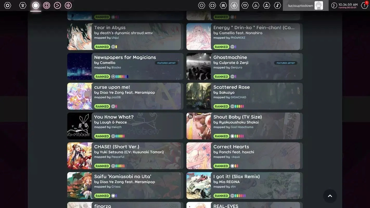 2、从游戏内目录中,你可以轻松下载涵盖动漫、游戏、流行歌曲等主题的谱面,且与PC、Mac版本完全互通。