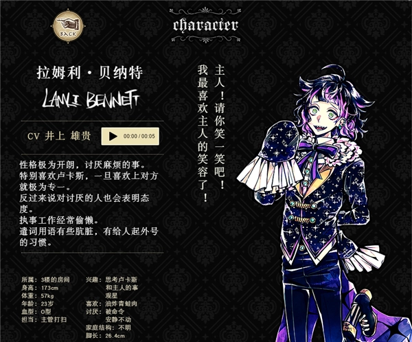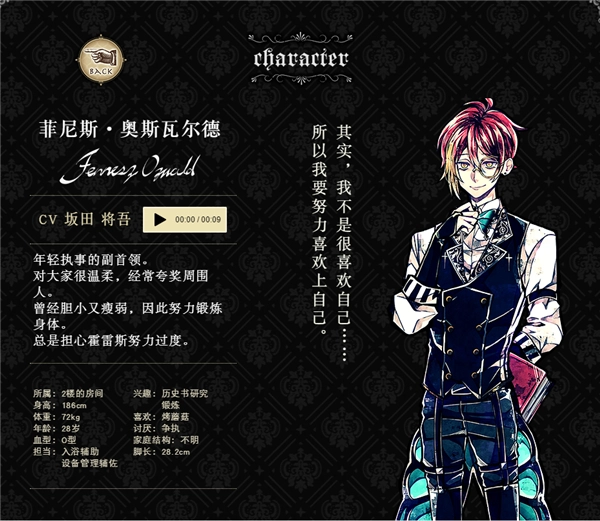 为自己的执事工作感到自豪。时刻挂念要用心照顾主人。温柔又可靠。深受其他执事信赖。很少说起自己的事,是个很神秘的人。