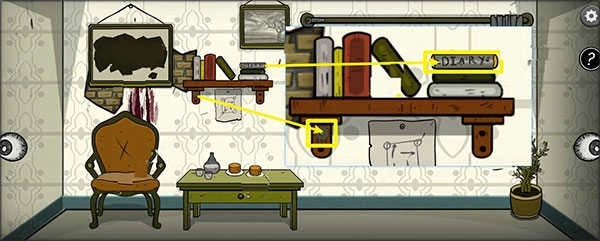 6、向右滑动视角进入窗户区域,在书架中央获取【日记本】和【齿轮1】。