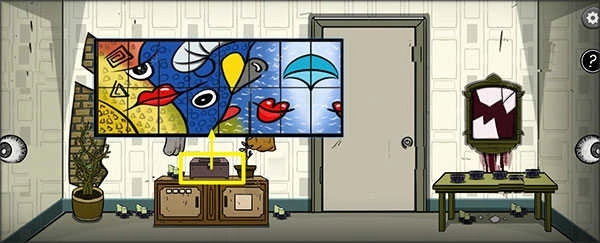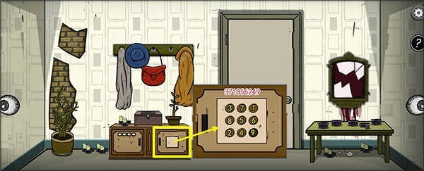 4、打开中央桌子下方右侧柜门,该柜需按特定顺序点击按钮解锁,正确密码为:371856249。开启后获得【美工刀】。