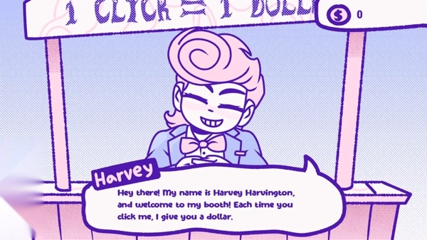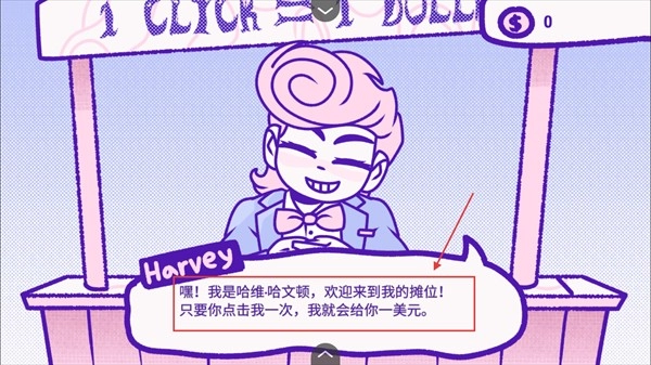 3、在哈维·哈文顿摊位点击他获取【1】美元,重复点击积累初始资金用于后续操作。