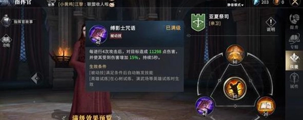 从技能方面来说,除了主动技能之外,被动技能【黑衣之誓】可降低友军所受伤害。在演武场/心树试炼的后期,敌我双方伤害能力都很高。雪诺最高15%的伤害减免,可大幅提升领主在对战中的胜率。