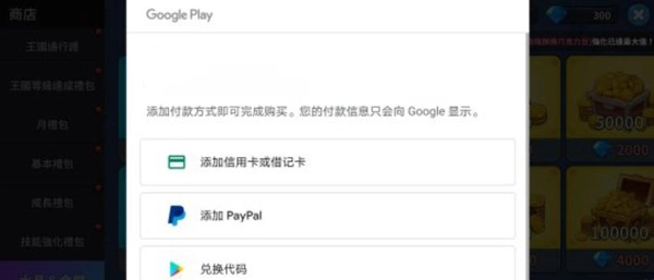 3、点击充值按钮后,会弹出选择付款方式的窗口。国际服的充值流程不像国内游戏那么便捷,国外充值通常需要使用借记卡、信用卡或者PAYPAL(类似于国内的支付宝或微信支付);如果没有这些支付方式,建议大家通过代充平台进行充值。