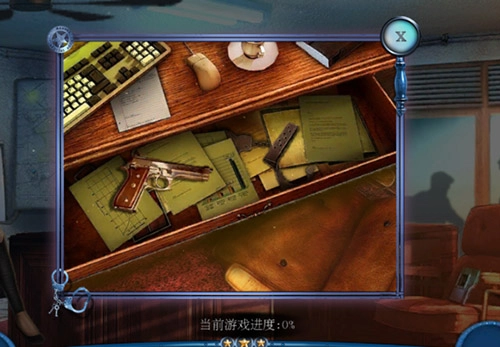 咖啡杯旁边拿警车钥匙;办公桌拿警徽、抽屉打开拿枪、子弹夹,组合,得枪。