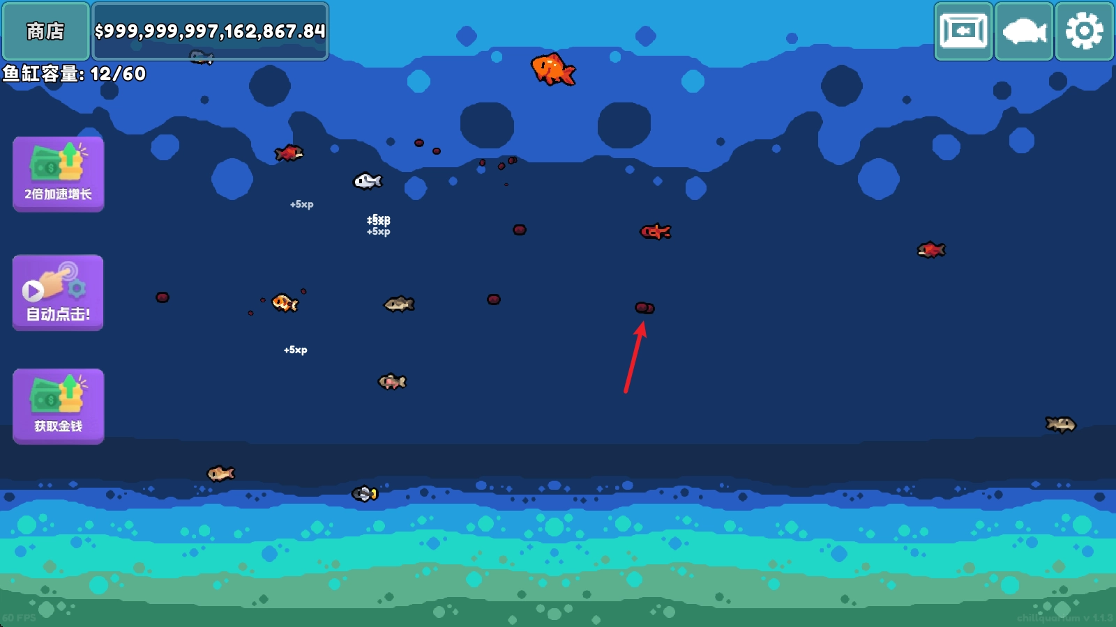 点击这些鱼苗,它们就会进入你的鱼缸。在鱼缸里,你只需点击屏幕就能投喂鱼粮,这样可以帮助鱼儿们增加经验值。