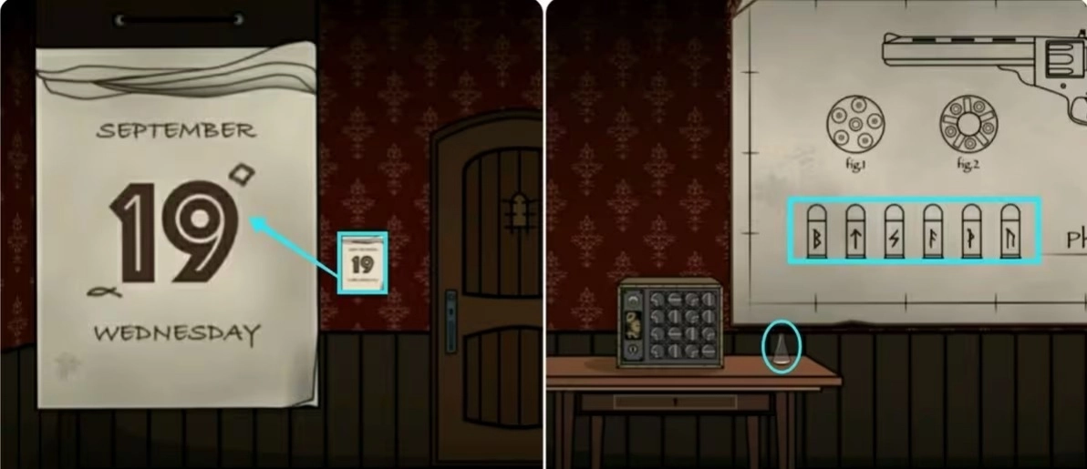 跟随线索来到嫌犯待过的702旅舍,在门口的日历上有我们需要的提示(符号对应的数字:∝1 ◇9),先记住它们,然后到左边拿走桌子上的长颈瓶并观察海报上的六个符号。