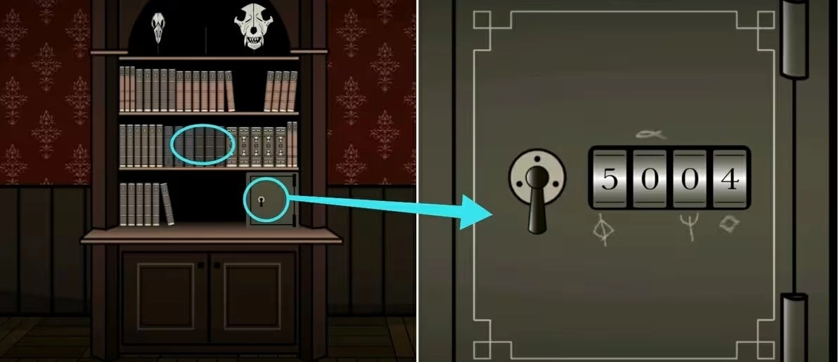 到书架那里先根据海报上的六个符号调整对应的书籍使其顺序一致,完成后可获得火柴,接着再根据下面保险箱上的符号提示获取密码2139,打开后拿走里面的钥匙和酒精灯。