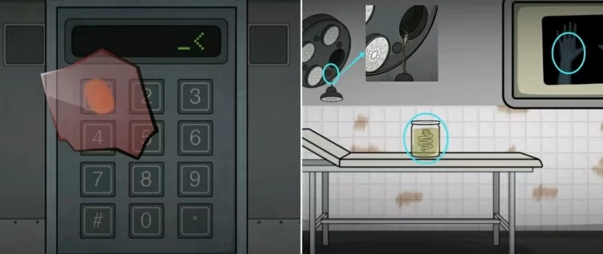 来到场景二(表)用红色玻璃观察右边房间的电子密码锁,根据其指纹大小可以获得密码1607,输入密码进入右边的房间(诊疗室)拿走无影灯上的保险丝,再拿走诊床上的标本罐。