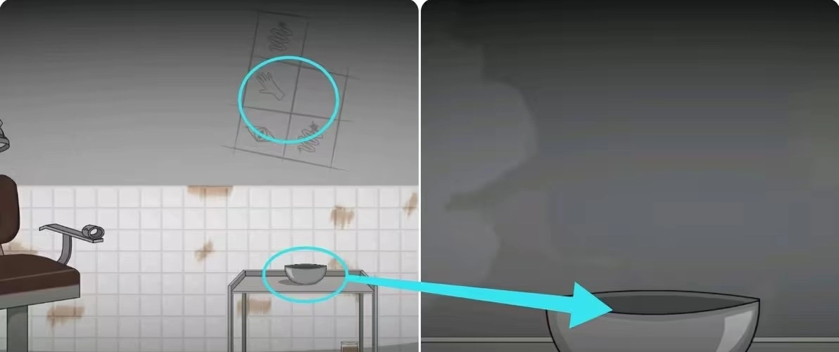 切换到“表”世界观察墙上的提示,然后拿走下面架子上的钥匙和手术刀,接着将大脑放在碗里用刀切成糊糊,再连碗一起端走。