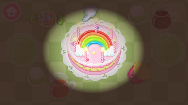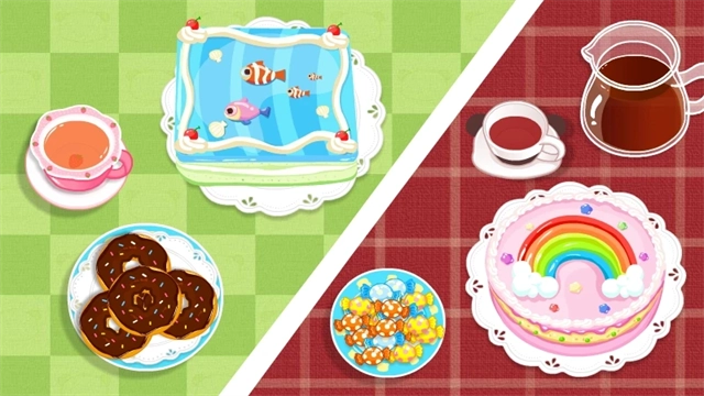 首先,我们来布置一个派对场景吧。这里有粉色花边、蓝色波点、草莓色格纹等多种桌布可供挑选,再搭配彩虹花纹、牛奶草莓和小鱼造型的三款蛋糕,就能组合出风格各异的派对。