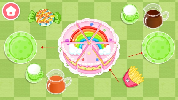 每个环节都安排了互动环节:蛋糕切分好后,宝宝得自己动手把蛋糕放到餐盘里;吃美味的蛋糕当然少不了饮料搭配,餐桌两边摆着两壶不一样的饮品,会不会是可乐和橙汁呢?赶紧倒一杯试试看吧。