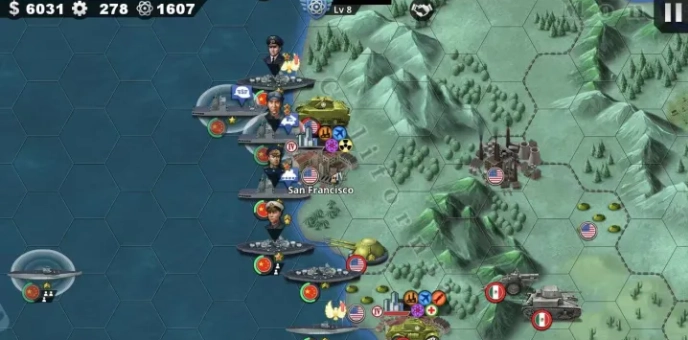 2、美国:最容易的国家,没有之一。1950征服北约优势的原因就是美国的存在。开局华盛顿和纽约上地标建筑。科技点后期会溢出不代表科技地标没有用。科技地标可以让你升级更快,从而更早解锁导弹发射场。两线作战,同时登陆欧洲和日本。需要大力支持日本和欧洲否则他们会被推掉。非洲虽然只有两个城但是不要忽视,一定要把苏联在非洲的兵力清理掉。