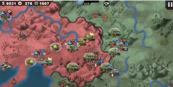 2、玩家指挥一个军团,按照战役目标攻击敌方某军团,夺取据点、造兵或攒资源、前往与下一个军团交战。