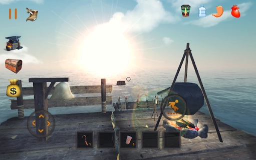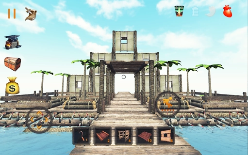 打造各类生存所需的装备、武器与工具,同时扩建自己的木筏,使其从简陋的初始状态逐步升级为稳固的海上堡垒。