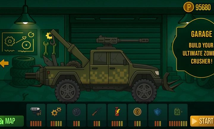 在正式进入游戏前,玩家能够对自己的车辆进行升级操作,你可以挑选不同的设施来提高车辆等级,完成升级后点击start按钮即可开启游戏。