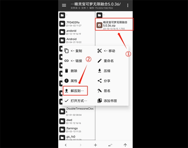 1.解压游戏资源:打开MT管理器,在SD卡路径下找到【精灵宝可梦无限融合5.0.36】,长按【精灵宝可梦无限融合5.0.36.zip】进行解压(解压到当前目录即可) ,需要保持在解压界面等待解压完成,由于游戏文件数量非常庞大,等待时间可能10min~1h不等,介意的谨慎下载解压。