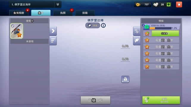 6、点击左侧的“装备”即可查看当前装备的钓竿,你可以在这个界面升级钓竿能力。