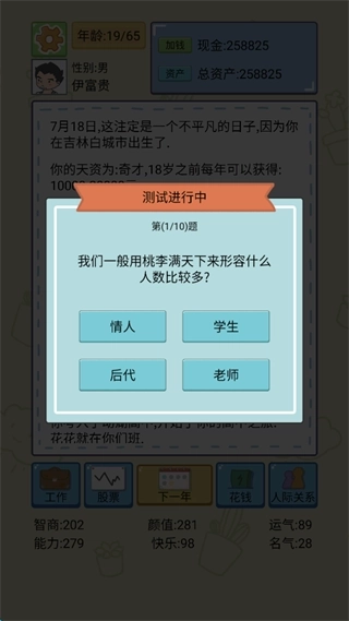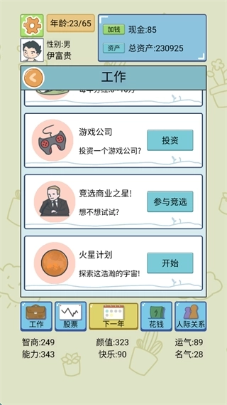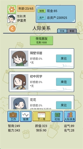 这些属性在游戏进程中发挥关键作用。智力影响学习能力、职业晋升中的知识技能考核;体质关乎健康状况,影响生病频率和恢复速度;魅力有助于社交互动,如交友、恋爱成功率;财运则与财富获取机遇相关。属性会随着角色经历的事件而改变,例如学习提升智力,锻炼增强体质,成功的商业活动增加财运等。