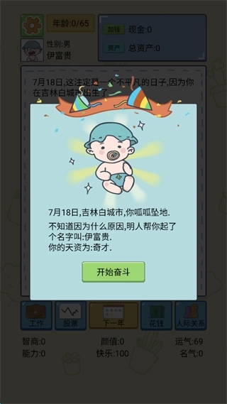 进入游戏后,玩家首先进行角色创建。可自定义角色的姓名、性别、外貌特征等基本信息。同时,游戏会随机生成初始的基础属性,如智力、体质、魅力、财运等,这些属性数值在一定范围内波动。玩家也可能有机会通过消耗特定资源或完成简单任务来微调属性。