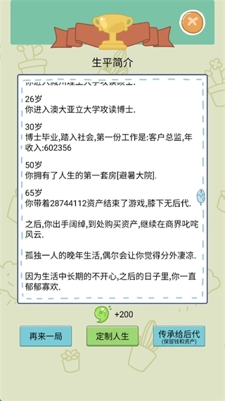 随机事件设置巧妙,贯穿人生全程。从偶遇贵人到遭遇意外,这些不可预测因素为游戏增添刺激与变数,让每一次人生体验都独一无二。