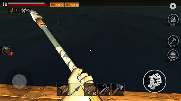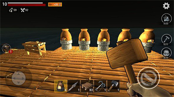 在船上或浮动平台上建造并升级各类设施,如工具台、净水器、烹饪台、种植箱、发电机与防御工事。