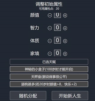 选完天赋就可以加点了,一般初始是20点,有的天赋有可能会带来额外加点。总共有四类属性,没种最多可以加到10点。在加点的时候,家境、体质、颜值都是比较重要的:家境值过低可能在小时候就会因贫早死;体质太低容易得病;颜值太低快乐容易减,会抑郁,然后智力不是那么重要,亲身体验啊,智力为零也是可以过的好,考上名校的。