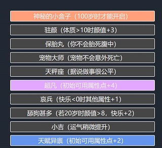 3、建议玩家们想要活到100岁选神秘的小盒子天赋,选了这个就主攻体质尽量活到100岁。要不然就主攻智力,去买乞丐的仙法,同时也不能丢掉体质。修仙的话千万不要选多重人格和克苏鲁。