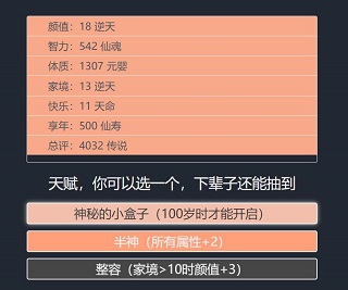天赋系统丰富多样,分为普通、稀有和神话等不同品质。普通天赋较为常见,能在某方面提供基础加成,如“早睡早起”可定期增加体质;稀有天赋效果更显著且独特,例如“天生丽质”大幅提升颜值,为社交和恋爱带来优势;神话天赋极为罕见,但拥有强大的特殊效果,像“天命之子”可能使角色在关键决策节点更容易获得成功。天赋不仅影响属性,还会改变角色的人生轨迹和事件触发概率。