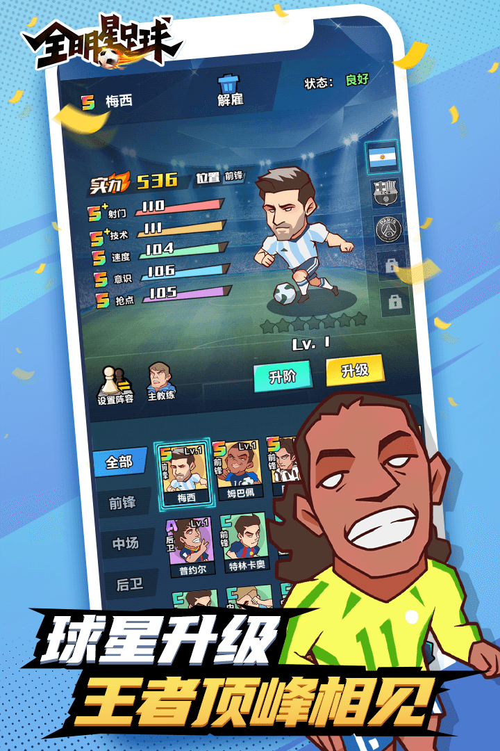 《全明星足球》是一款足球经营类手游,游戏中玩家既是老板又是经理,满世界挖潜力股。玩法偏休闲,不费劲,但真到了比赛,排兵布阵、战术安排就得注意了,稍微不注意就可能翻车。最不错的是玩家可以签下那些传奇巨星,成就感拉满。而且社交互动挺多,跟玩家踢两把很有意思。想组建自己的梦之队捧杯的兄弟,赶紧进来下载试试!