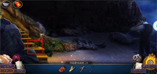 再次点击之前拍照的位置前往悬崖,旁边红框标注的台阶上有一个标志,点击放大该标志后可获得百合花象征物。