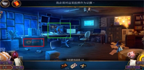 进入屋内后,首先与屋内人物进行对话。对话结束后,直接点击界面右上角的按钮前往后院。到达后院后,先点击位于中间位置的侦探,获取带有红框标识的照相机;接着点击黄框区域将画面放大,从中取得剪枝钳;再点击绿框区域放大画面,拿到门左侧的抽气泵。最后点击灰框所在位置,使用刚得到的照相机进行拍摄以留存证据,至此完成教程。