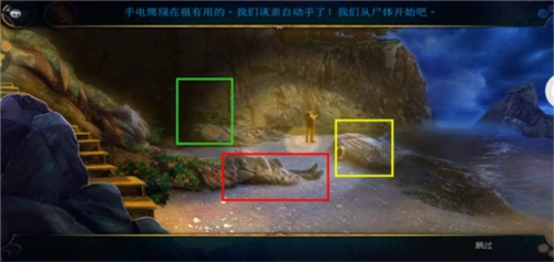 回到悬崖边,在阴影区域使用手电筒。先点击红框位置放大画面,然后用照相机对尸体拍照留存证据。接着移开尸体头部的布,再次用照相机拍摄尸体脸部记录证据。之后取下尸体手上的手表获取证据,再掀开尸体身上的衣服找到钱包,从中得到密码图案。随后点击黄框处的小船放大,移开救生圈后,在小船左侧有绳子的地方使用充气浮标,再用打气筒(抽气泵)操作,多次点击小船后拿到马克的钱包,阅读里面的纸条获取线索,最后点击钱包左侧得到卡片。最后点击绿框处放大画面,使用剪枝钳,获取里面的第二个金字塔碎片。