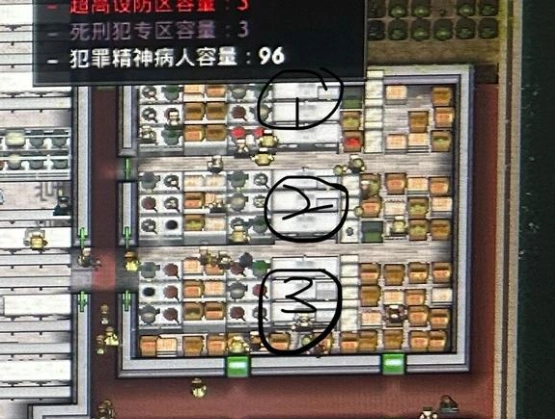 话再说回来,我不太建议萌新一开始就搞一个大食堂,最好是轻型犯、普通犯、重型犯各设一个,分开管理不仅需要的警卫更少,囚犯也没那么容易闹事。