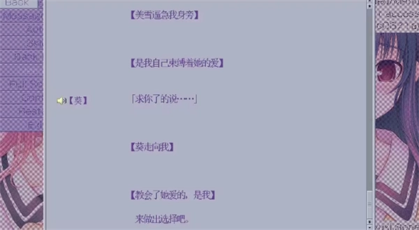 1.关于对美雪选说喜欢或不说喜欢这一剧情,如果你只需选了一个选项那么你会进入无限循环,如果要使剧情进行下去两个选项必须都选一遍。这时你需要调出菜单栏选择restart ,重新过这一段剧情选择另一个选项。