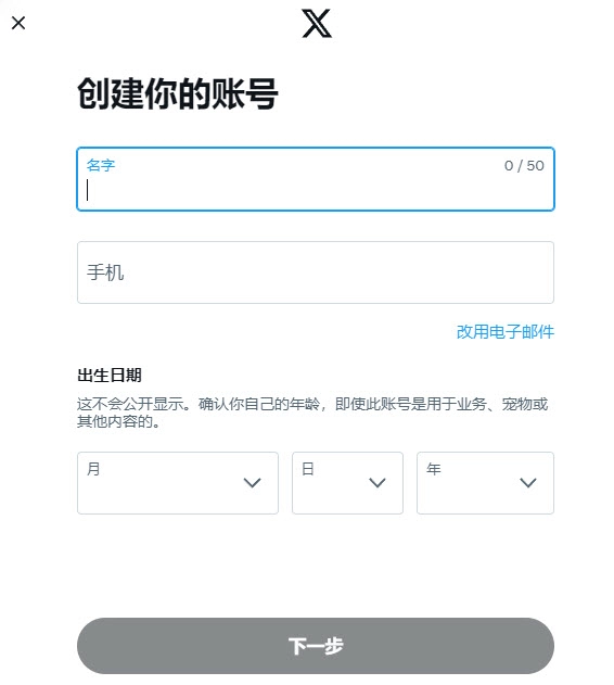 生日:请选择你的出生日期,这一步骤主要是为了确认你满足 Twitter 的使用年龄条件。
