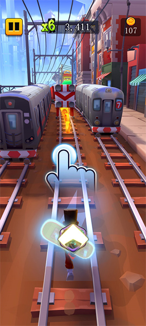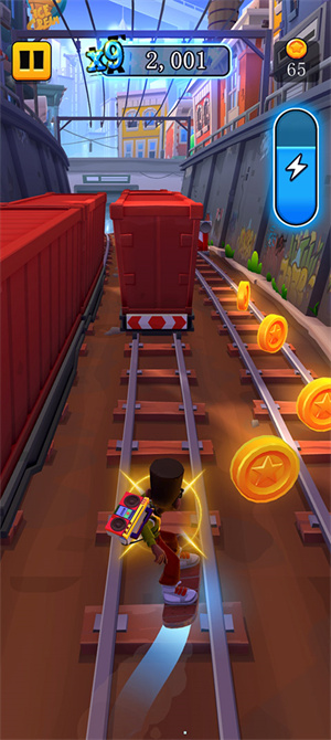 3、开始游戏之后,角色会不断的在地图中奔跑,玩家需要上下左右滑动来躲避障碍物,不被后面的保安追上。