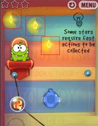 在某一关卡中,糖果被多根绳子悬挂,下方有一个弹簧。玩家先切断上方一根绳子,让糖果荡向弹簧,再触发弹簧将糖果弹起,越过障碍物,最终落入奥姆口中。