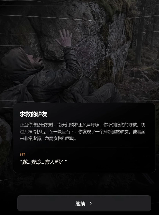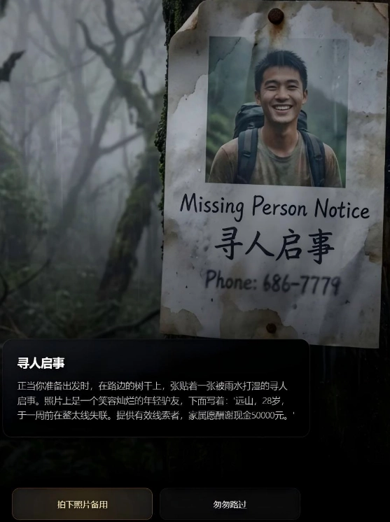 在进山开头,玩家会碰到一张寻人启示,说 28 岁的远山于一周前失联,家属愿意酬谢提供线索者 50000 元。如果玩家在南天门垭口选择走小路,就会偶遇摔断腿的远山。