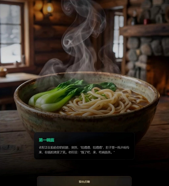 在接受远山的求救请求、跋山涉水终于走到大爷海接待站时,玩家可以吃上热腾腾的面条……在经历极寒、病痛、幻觉等折磨后,这一碗代表着温暖与烟火气的面条,显得那么珍贵,就好像终于回到了人类社会的怀抱。