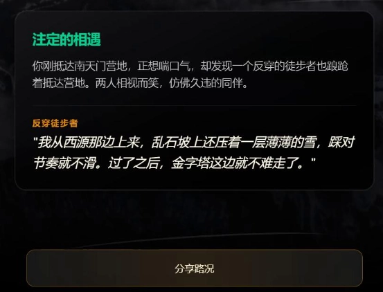 还有在到达南天门营地时,玩家会遇到从西源反穿上来的徒步者,双方热情地分享着路况。虽然只有这一面之缘,但在荒郊野岭中偶遇的陌生人,简直就像久违的同伴。