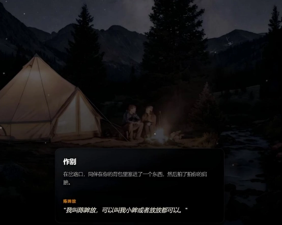 而在水窝子营地,玩家会碰到决定和自己同行的驴友。他在到达 2800 营地后因为脚肿不适、决定下撤,临走还给玩家塞了个医疗包,他说自己叫陈眸放。