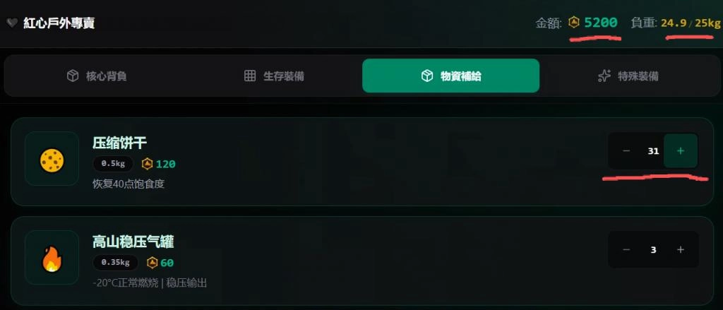 游戏初始会给玩家提供 20000 元的购买预算,用于购买核心背负(不同容量的背包)、生存装备(登山杖、护膝、手套、帐篷等)、物资补给(压缩饼干、气罐、炉头、医疗包等)。