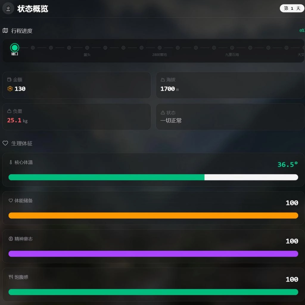 这 20000 元怎么花?哪些物资该多买点,负重怎么分配?都是需要考虑的问题。毕竟,在后续的徒步中,如果捡了更多东西、负重超了,体力会更快速消耗;而恢复体力,或是开炉子烧热水、取暖,治疗发烧、高原反应等疾病,则会消耗不同类型的物资。