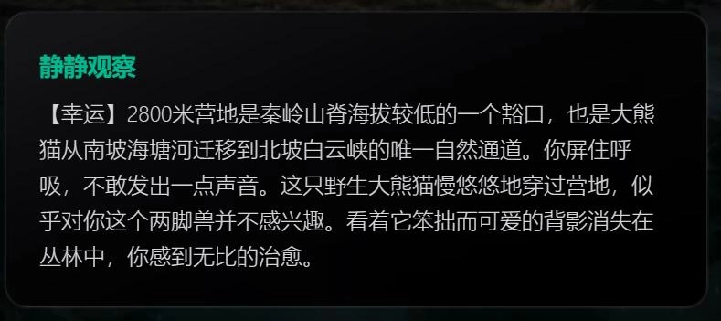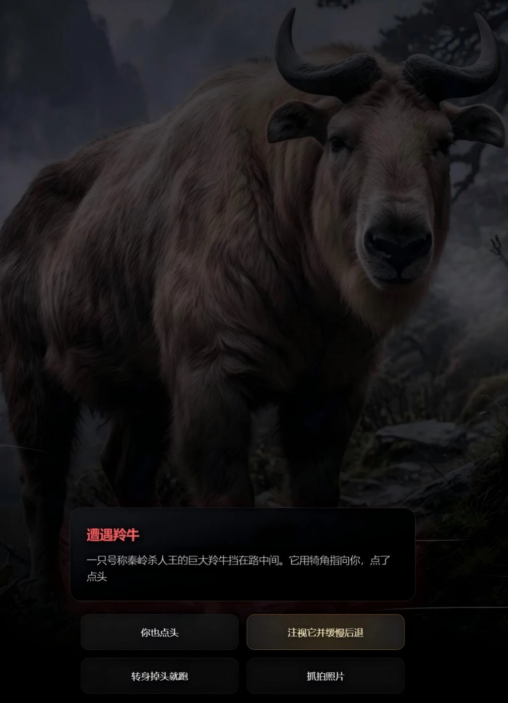 比如,碰到野果子吃不吃?(葡萄君选过吃,直接腹泻,然后发烧,需要消耗医疗包物资来救治)看上去很清澈的水能不能直接喝?(葡萄君选过直接喝,也是腹泻发烧)碰上号称 " 秦岭杀人王 " 的巨大羚牛,该怎么办?