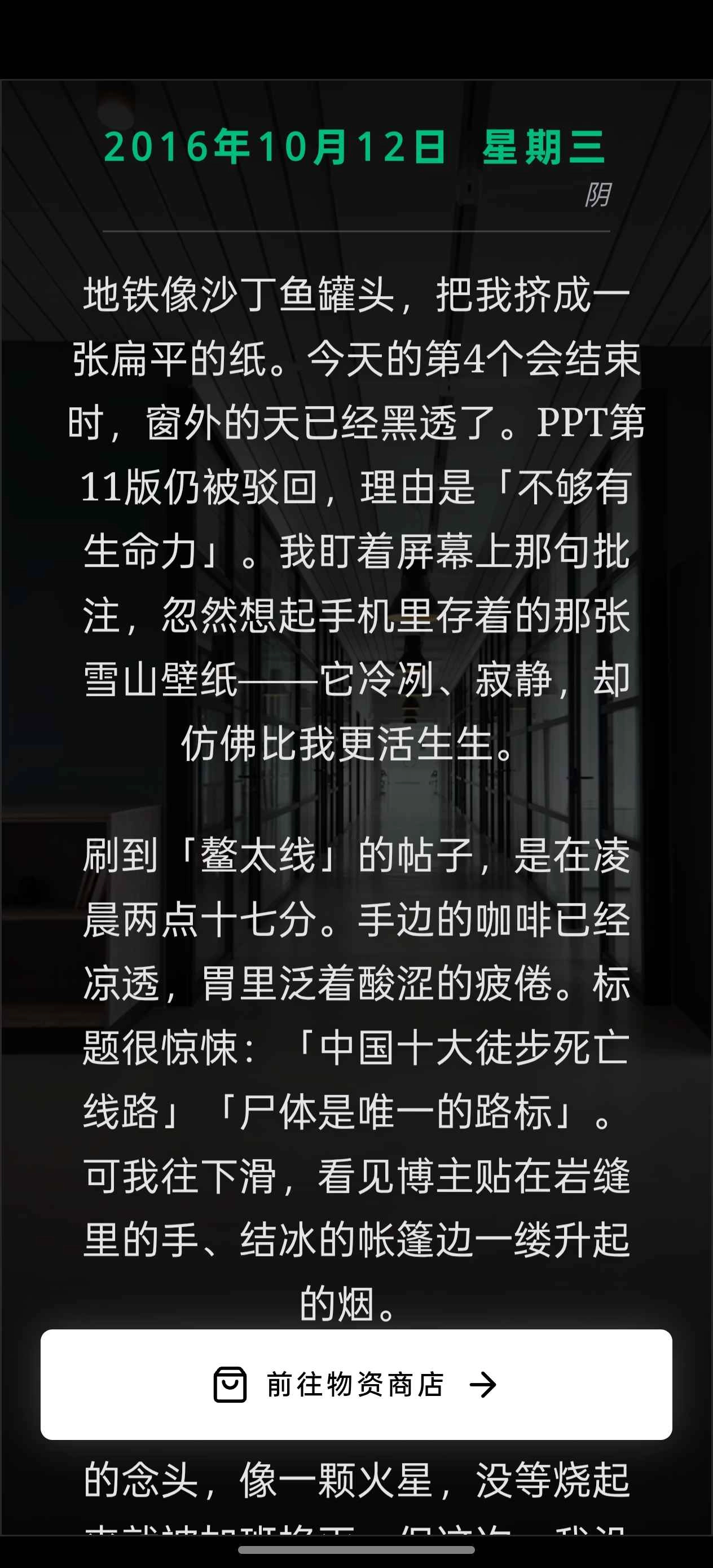 赛博徒步之生死鳌太线游戏是一款文字冒险类型的游戏,这款游戏以中国秦岭地区高危徒步路线“鳌太线”为原型,完整复刻了约120公里的核心路段,包括九重石海、药王庙、拔仙台、太白梁等真实地标。地形、海拔与植被分布均依据实地测绘数据建模,构建出科技与自然崩坏交织的末世荒野场景。这种设计为玩家提供了一个充满挑战和刺激的游戏体验,同时结合了冒险和生存元素。